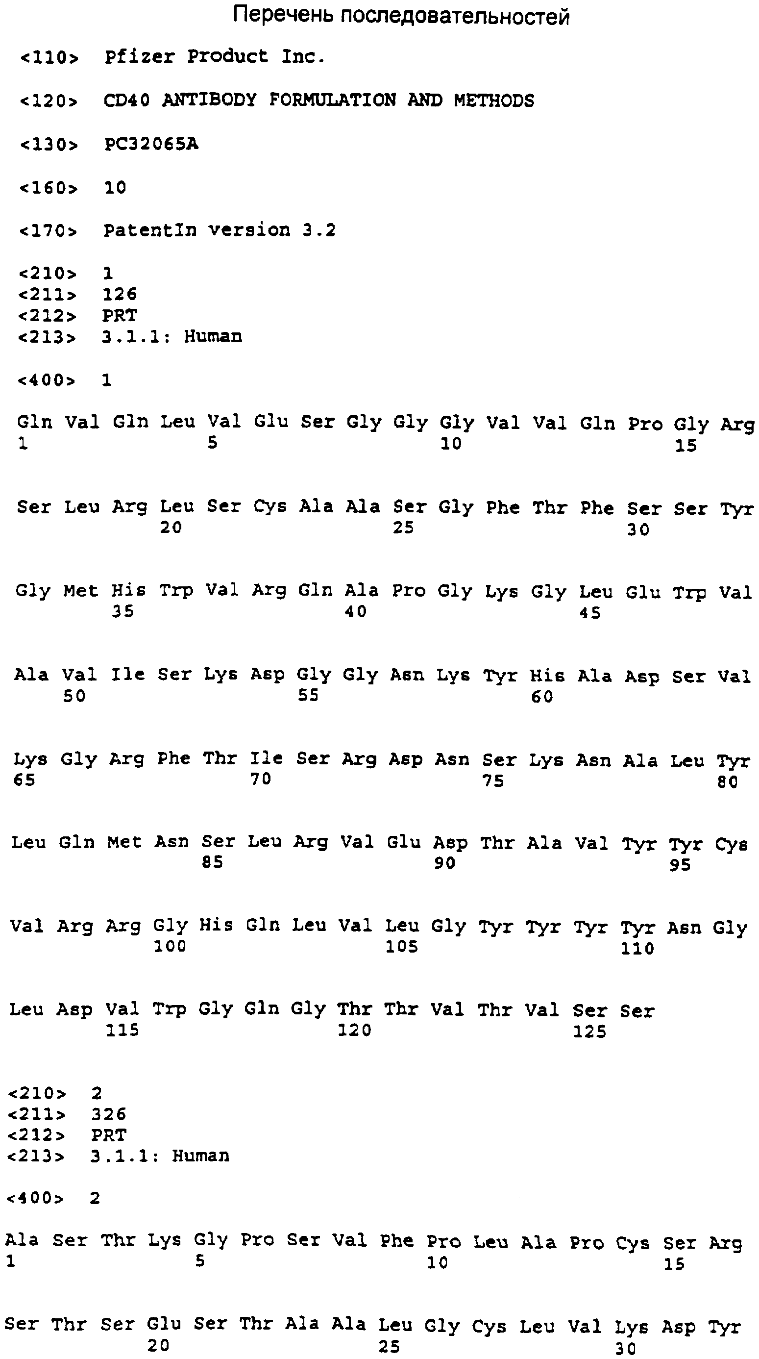 CD40 является членом суперсемейства рецепторов фактора некроза опухолей (TNFR). Он экспрессируется на антигенпрезентирующих клетках (В-клетках, дендритных клетках, моноцитах), гематопоэтических предшественниках, эндотелиальных клетках, гладкомышечных клетках, эпителиальных клетках, а также на большинстве опухолей человека (Grewal & Flavell, Ann. Rev. Immunol., 1996, 16:111-35; Toes & Schoenberger, Seminars in Immunology, 1998, 10 (6): 443-8). В исследованиях с использованием CD40-агонистических агентов сообщалось, что стимуляция рецептора CD40 вызывает каскад эффектов, связанных с противоопухолевой активностью. Например, показано, что стимуляция рецептора CD40 на антигенпрезентирующих клетках улучшает их созревание, антигенпрезентирующую функцию, костимуляторный потенциал и высвобождение ими иммунорегуляторных цитокинов (Lee et al., PNAS USA, 1999, 96 (4): 1421-6; Cella et al., J. Exp.Med., 1996, 184 (2): 747-52). Также сообщалось, что агонисты CD40 стимулируют апоптоз CD40(+)-опухолей и увеличивают возможность их обработки дендритными клетками (von Leoprechting et al., Cancer Res., 1999, 59: 1287-94; Sotomayo et al., Nature Medicine, 1999, 5 (7): 780-87; Eliopoulos et al., Mol. Cell Biol., 2000, 29 (15): 5503-15; Ziebold et al., Arch. Immunol. Therapiae Experimentalis, 2000, 48 (4): 225-33; Hoffmann et al., J. Immunol., 2001, 24 (2): 162-71). Значимость этих иммуностимулирующих и прямых противоопухолевых эффектов была продемонстрирована на животных моделях, где было показано, что агонистические антитела к CD40 предотвращают рост опухолей и реверсируют толерантность к опухолям (Diehl et al., Nature Med.,1999, 5 (7): 774-9; Francisco et al., Cancer Res., 2000, 60 (12): 32225-31). Следующие патентные публикации: US 5786456; US 5674492; WO 02/088186; US 2003059427; US 20020142358; WO 01/56603; US 5801227; EP 806963; WO 88/06891 и WO 94/04570 относятся к антителам к CD40. Однако не описаны высокоэффективные способы введения и препараты антител к CD40. Также будет полезным стабильный препарат, пригодный для применения в таком лечении.