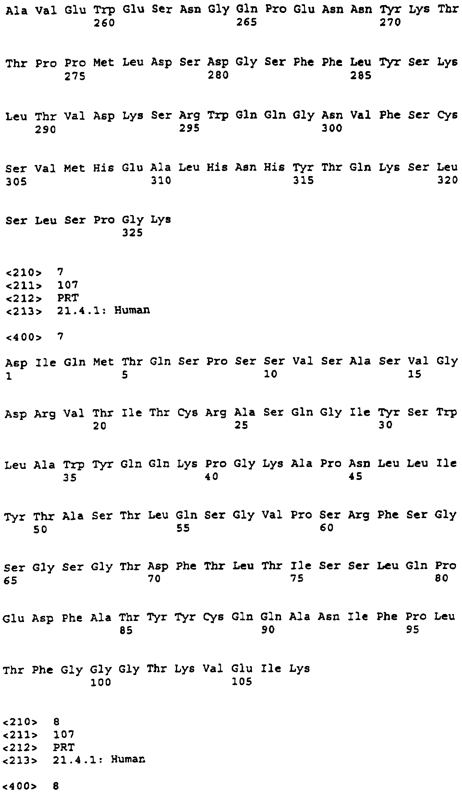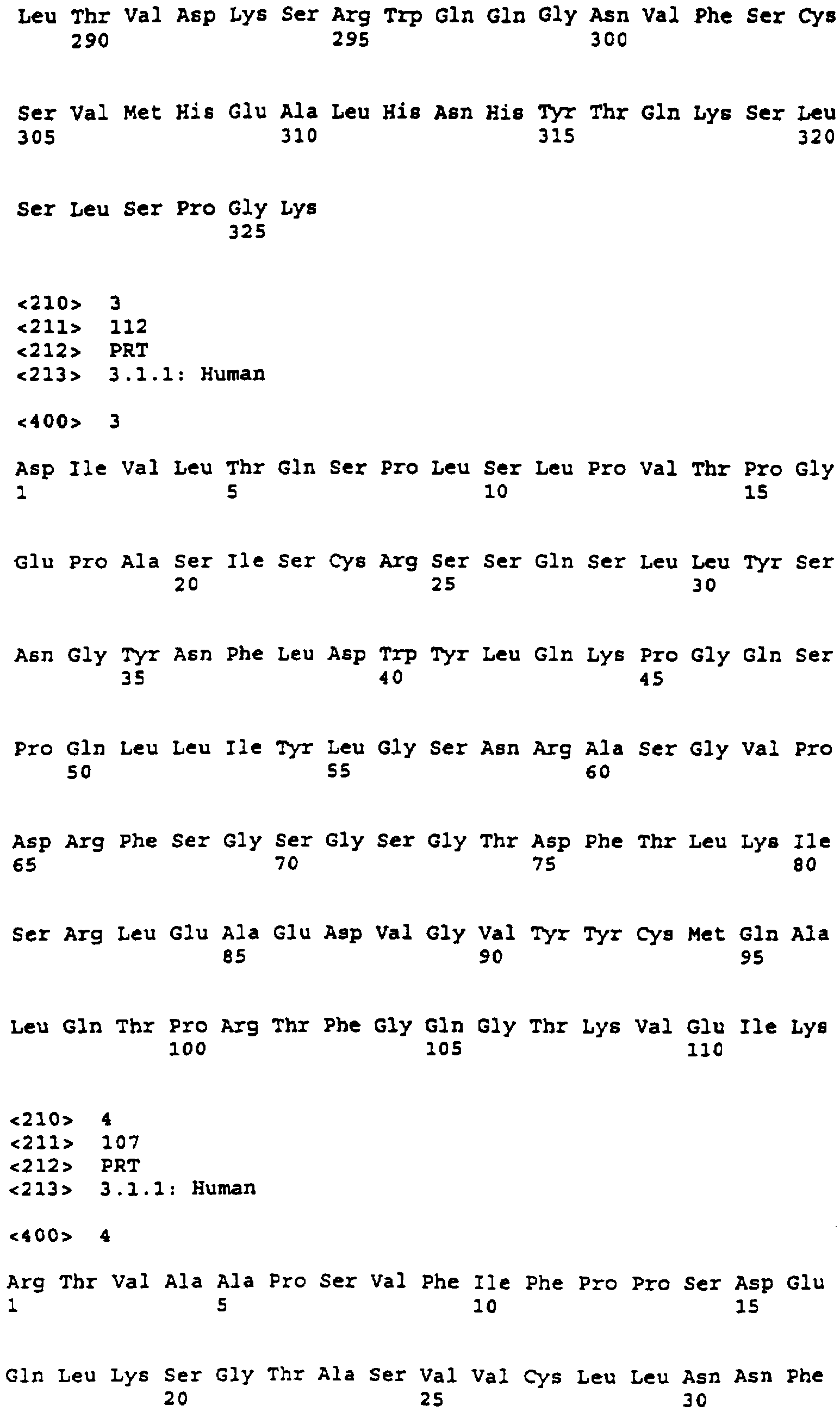 Вариабельная (SEQ ID NO:3): DIVLTQSPLSLPVTPGEPASISCRSSQSLLYSNGYN FLDWYLQKPGQSPQLLIYLGSNRASGVPDRFSGS GSGTDFTLKISRLEAEDVGVYYCMQALQTPRTFG QGTKVEIK Константная (SEQ ID NO:4): RTVAAPSVFIFPPSDEQLKSGTASWCLLNNFYPR EAKVQWKVDNALQSGNSQESVTEQDSKDSTYSLS STLTLSKADYEKHKVYACEVTHQGLSSPVTKSFNR GEC |