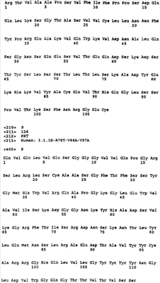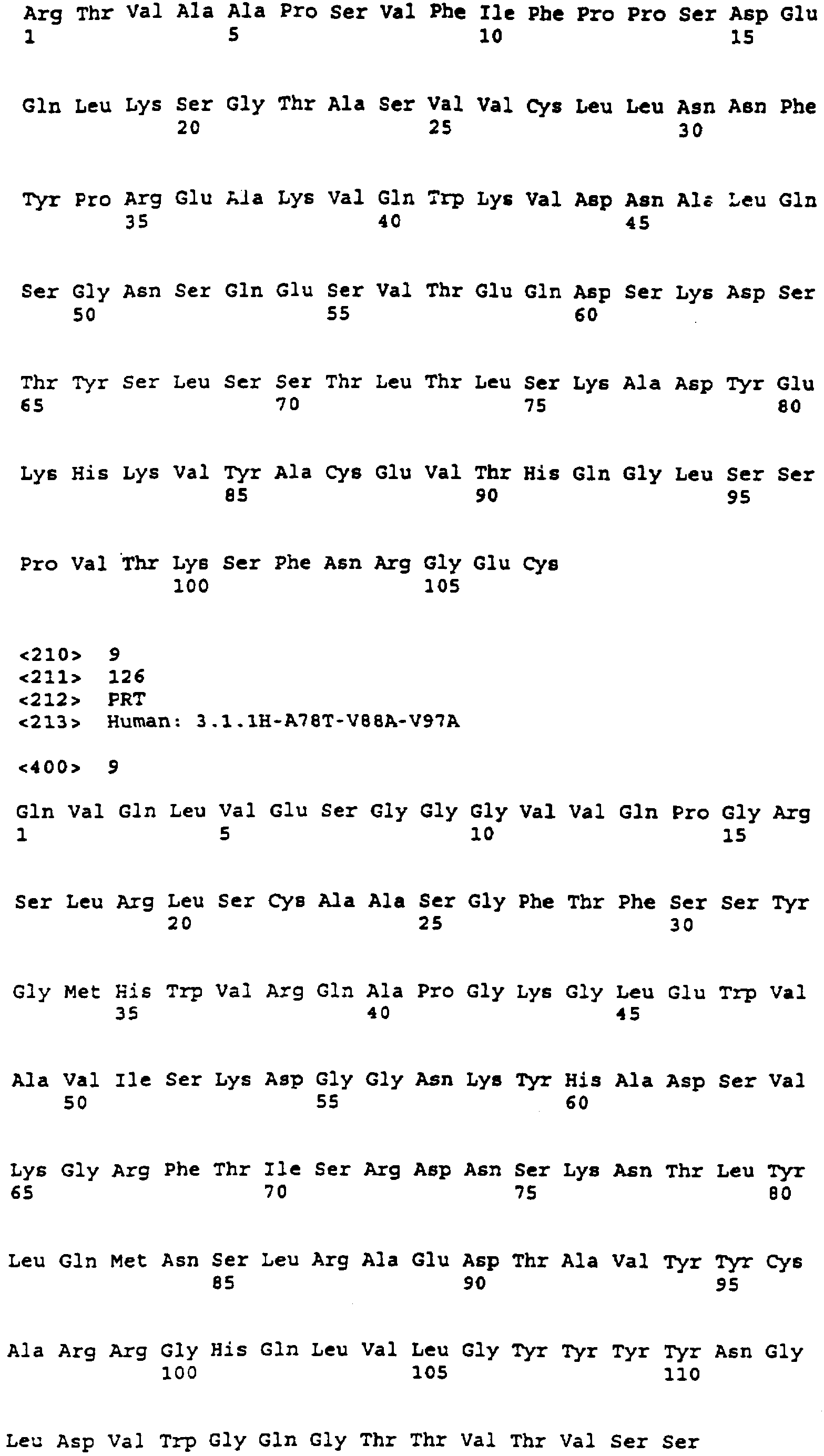Таким образом, аминокислотная последовательность антитела 21.4.1 содержит аминокислотные последовательности, изложенные в SEQ ID  : 5-8, аминокислотная последовательность антитела 3.1.1 содержит аминокислотные последовательности, изложенные в SEQ ID  : 1-4, и аминокислотная последовательность антитела 3.1.1H-A78T-V88A-V97A/3.1.1L-L4M-L83V содержит последовательности, изложенные в SEQ ID NO:9, SEQ ID NO:2, SEQ ID N010 и SEQ ID NO4. Аминокислоты, которые различаются у 3.1.1 и 3.1.1H-A78T-V88A-V97A/3.1.1L-L4M-L83V, подчеркнуты.