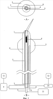 Коронарный катетер (фиг.1) содержит: 1 – направляющий палец; 2 – баллон; 3 – металлическую втулку; 4 – шахту для раздувания баллона; 5 – стержневой электрод; 6 – рентгеноконтрастный маркер; 7 – центральный просвет; 8 – базисный катетер и связан с: 9 – движущими элементами; 10 – воздушным насосом; 11 – высокочастотной электрохирургической установкой; 12 – системой управления.