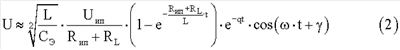 Электрические колебания, возникающие в секции II катушки индуктивности 4, являются электростимулирующим сигналом. Амплитуда напряжения на электродах 5 и 6 и тока через межэлектродную ткань зависит от уровня электромагнитной энергии, накопленной в катушке индуктивности за время действия открывающего импульса и от реактивной емкостной и активной составляющих импеданса межэлектродной ткани. Из уравнения (1) видно, что изменяя длительность открывающих импульсов, подаваемых на вход электронного ключа 3, можно управлять уровнем энергии электростимулирующего воздействия, амплитуда, ток, частота и затухание электрических колебаний которого могут описываться уравнениями (2) (5), где U – напряжение электрических колебаний между активным 5 и пассивным 6 электродами, I – электростимулирующий ток, – частота, q – затухание электрических колебаний, , – углы запаздывания, остальные обозначения расшифрованы выше.