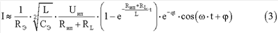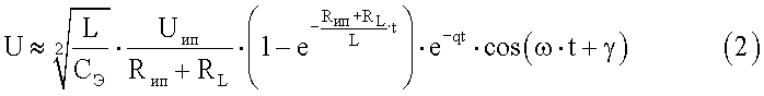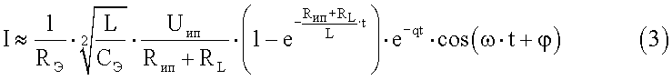 По окончании открывающего импульса накопленная электромагнитная энергия Э вызывает в колебательном контуре, образованном индуктивным сопротивлением секции II катушки индуктивности 4 и импедансом межэлектродной ткани 12, вызывает электрические колебания, частота, амплитуда и скорость затухания которых будут с высокой достоверностью определяться резистивной и емкостной составляющими импеданса межэлектродной ткани 12. Действительно, если проанализировать эквивалентную электрическую схему этого колебательного контура, приведенную на фиг.5, то можно установить, что: