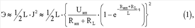 где L – индуктивность катушки 4, J – ток насыщения, Uип – напряжение источника питания 9, Rип – внутреннее сопротивление источника питания 9, RL – сопротивление потерь катушки индуктивности 4, t – длительность открывающего импульса.