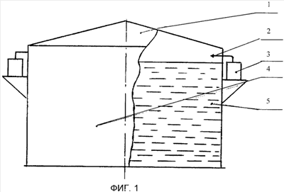 На фиг.1 представлена схема резервуара (РВС) 4 с фиксированной крышей 1, заполненного ЛВЖ (ГЖ) 5 и снабженного устройством для тушения 3 с сопловым блоком 2.