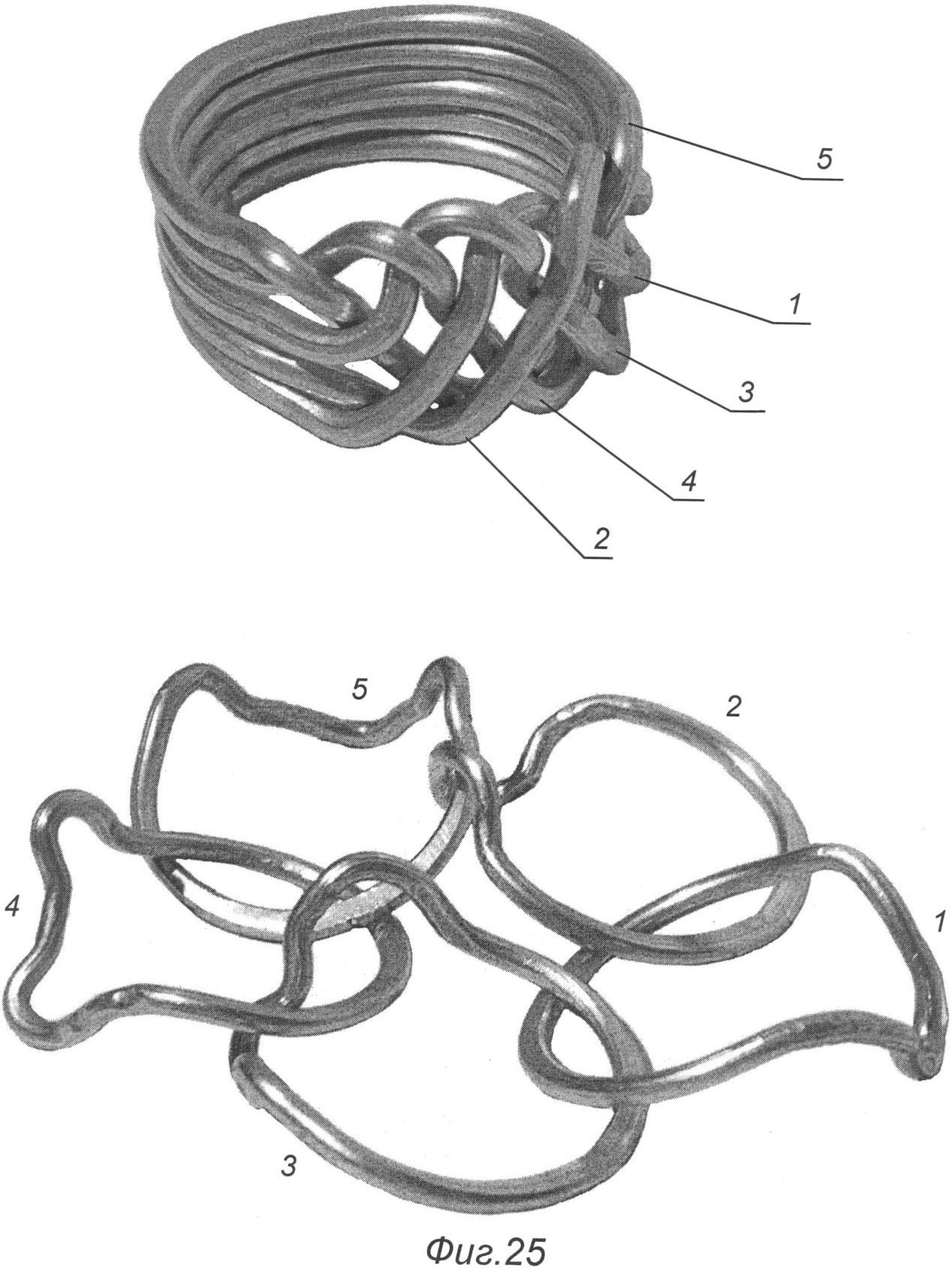 На фиг.25 приведен фоторисунок (подправленная цифровая фотография) опытного образца головоломки в собранном и разобранном состоянии, схема переплетения которой показана на фиг.1 (после начала серийного производства надо будет заменить его на фотографию более аккуратного изделия, а пока имеются только рабочие образцы, которые можно попытаться пособирать – например на экспертном совещании или еще где-нибудь).