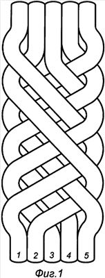 На фиг.1 показана схема переплетения головоломки из пяти колец, у которой крайнее кольцо 1 сцеплено с вторым кольцом от этого края 2 и третьим кольцом 3, имеющим первый изгиб переплетения в противоположную сторону относительно изгиба второго кольца 2, третье кольцо 3 сцеплено с четвертым кольцом 4, как имеющие однонаправленные первые изгибы переплетения, четвертое кольцо 4, как второе кольцо от другого края, сцеплено с пятым, другим крайним кольцом 5, которое еще сцеплено со вторым кольцом 2, имеющим первый изгиб переплетения в противоположную сторону относительно изгиба четвертого кольца 4, образуя в разобранном состоянии головоломки пятизвенную замкнутую цепь.