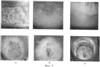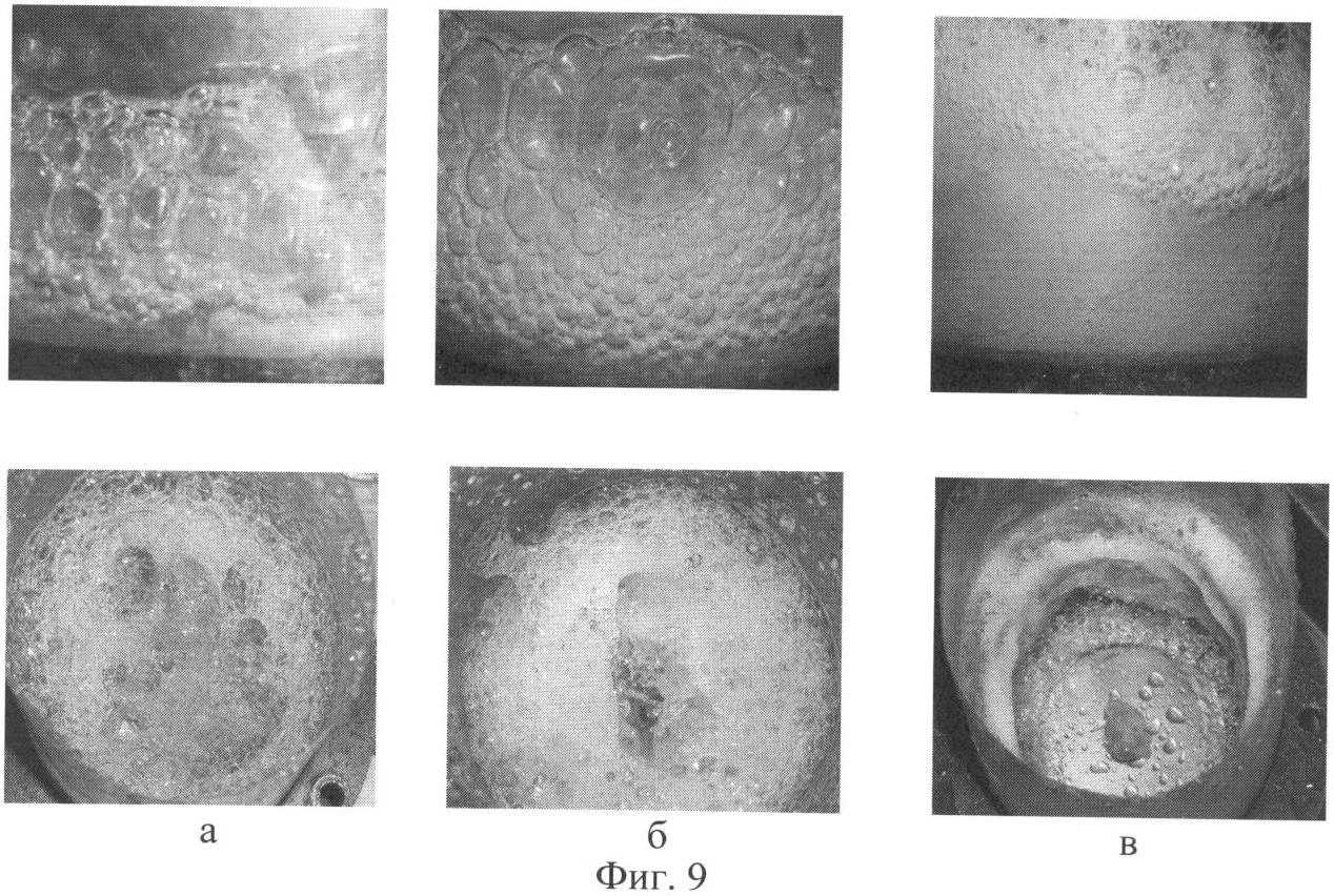 Контактное устройство тепломассообменного аппарата работает следующим образом. Газ (пар), перемещаясь вверх, поступает в наклонные однонаправленные каналы 11 и приобретает тангенциальную скорость (вращательное движение). На выходе из каналов 11 газ (пар) равномерно распределяется по выступам 16 и входит в контакт с жидкостью, размещенной на поверхности вихревой тарелки 2. Он интенсивно дробится на мелкие пузырьки (2-0,25) мм, образуя газожидкостную смесь в виде вращающего цилиндра, где и реализуется тепломассообмен. В зависимости от расхода газа наблюдается три режима течения газожидкостной смеси на ступени (фиг.9): барботажный; кольцевой; пленочный.