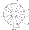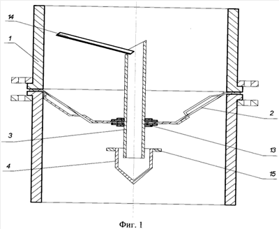 Перетекание жидкости с тарелки на тарелку осуществляется через центральную переливную трубу 3 и гидрозатвор 4. Отвод жидкости из вращающегося газожидкостного слоя осуществляется посредством устройства для отвода жидкости 14, выполненного из уголка. Жидкость захватывается поверхностью уголка и стекает в переливную трубу при сохранении определенного уровня жидкости на ступени.