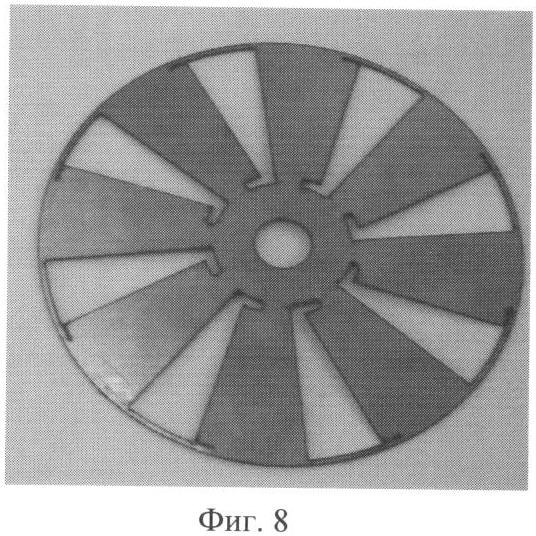 На фиг.1 представлен общий вид контактного устройства тепломассообменного аппарата; на фиг.2 – разрез вихревой тарелки; на фиг.3 – вид сверху вихревой тарелки; на фиг.4 – вид сверху профилированного листа; на фиг.5 – профилированный лист с просечками, снабженными треугольными выступами; на фиг.6 – устройство для отвода жидкости из вращающегося газожидкостного слоя в переливную трубу, выполненное из уголка; на фиг.7 – фотография вихревой тарелки; на фиг.8 – фотографии верхнего профилированного листа; на фиг.9 – фотографии режимов течения газожидкостного слоя на вихревой тарелке при D=114 мм, где показаны режимы: а – барботажный; б – кольцевой; в – пленочный.