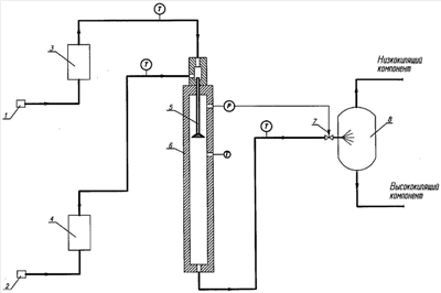 Трубчатый реактор (6) имеет вид вертикального цилиндрического корпуса объемом 0,002-0,1 м3, закрытый с одного торца крышкой, через которую пропущен струйный диспергатор (5), а с другого торца закрытый днищем, имеющее выпускное отверстие для продуктов реакции. Струйный диспергатор (5) выполнен по существу в виде цилиндрической трубы, имеющей два впускных отверстия, соединенных линиями соответственно со средствами нагрева (3, 4), и одно выпускное отверстие для реакционной смеси, соединенное с внутренней полостью трубчатого реактора (6). Трубчатый реактор (6) содержит также измерительные средства для контроля температуры и давления.