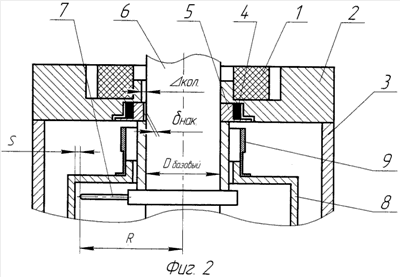 В результате предлагаемого взаиморасположения элементов магнитной опоры в отличие от известных конструкций у полюсного наконечника 4, относительно которого центрируется ферромагнитная втулка 9, и, следовательно, внутренняя стенка ротора 8, и у вылета R трубки верхнего отборника 7 общая база. При этом расстояние S от трубки верхнего отборника 7 до внутренней стенки ротора 8 может изменяться только до величины зазора нак.max между базовой поверхностью Dбазовый газового коллектора 6 и центральным отверстием сборки промежуточной детали 5, обработанной совместно с наконечником 4, а не на существующую в прототипе сумму зазоров ( нак. max+ кол. max), потому что смещение газового коллектора 6 в центральном отверстии крышки 2 корпуса 3 в пределах зазора кол не влияет на изменение расстояния S.
