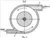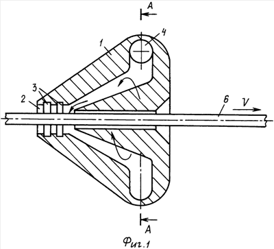 Показанное на фиг.1 устройство состоит из тороидальной камеры 1, выходного сопла 2 с кольцевыми канавками 3. Камера имеет два тангенциальных сопла 4 и 5 (фиг.2). Очищаемое длинномерное изделие 6 протягивается через камеру в направлении, указанном стрелкой со знаком V.