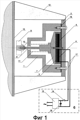 В устройстве обратную реакцию от системы ударник 9, шток 8, якорь 7 принимает на себя броневой каркас 5. Часть ответной реакции гасится демпфирующей прокладкой 18. При меньших расстояниях ребра жесткости в местах крепления косынок 12 оказывают значительное влияние на расхождение ударных волн.