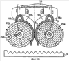 На рабочей стадии, изображенной на фиг.2, первый стержень b1 поступил в первичный желоб 18а по направляющему каналу. Первичный желоб закрыт вращающейся поверхностью барабана 20а. Первый стержень, таким образом, временно удерживается в первичном желобе, в то время как другой вращающийся вторичный желоб 22b остается свободным по мере продвижения к пустому первичному желобу 18b. Барабан 20а вращается по направлению против часовой стрелки, а барабан 20b – по часовой стрелке.