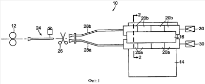 Как видно из фиг.1, множество первичных и вторичных барабанов 20а и 20b установлено аксиально партиями между каждым из первичных желобов 18 а и 18b и столом для охлаждения. Приводные двигатели 30 обеспечивают вращение барабанов каждой партии.