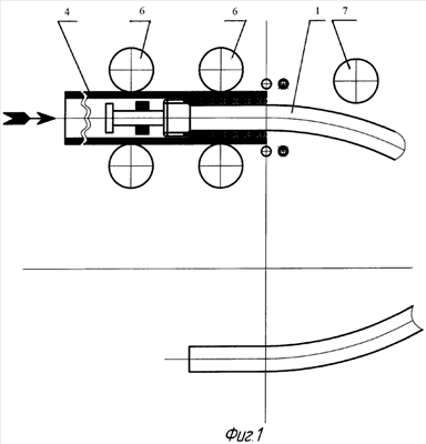 Для реализации заявляемого способа изготовления элемента криволинейной формы, содержащего внутреннюю 1 трубу, имеющую криволинейную 2 и прямолинейную 3 части, и наружную трубу 4, устанавливаемые коаксиально относительно друг друга, необходимы гибкий дорн 5, например, такой как описан в издании Е.Н.Мошина «Гибка и правка на ротационных машинах. Технология и оборудование.», 1967, стр.172-175, и трубогибочная машина, например такая как описана в ранее приведенном издании на стр.134-137, имеющая направляющие 6 и гибочные 7 ролики, в которой имеется возможность перемещения наружной трубы 4 с гибким дорном 5 сквозь кольцевой индуктор 8 токов высокой частоты с одновременным применением местного нагрева участка наружной трубы 4 токами высокой частоты и последующего охлаждения этого участка с помощью водяного спрейерного устройства 9, соединенного с кольцевым индуктором 8 токов высокой частоты. При этом для охлаждения внутренней трубы 1, имеющей криволинейную 2 и прямолинейную 3 части, предусмотрена подача холодной воды, протекающей по внутренней трубе 1 в течение всего процесса изготовления.