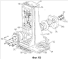 Фиг.10 – вид в перспективе с разнесением деталей, показывающий основной корпус и узел из вала и кулачка для управления вертикальным движением подвижной части кромкозагибочного станка с Фиг.3.