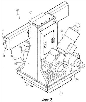 подвижное основание 24, установленное на неподвижном основании 22 с возможностью движения параллельно последнему к зоне обработки или от нее (двойная стрелка Х), в дальнейшем называемого движением в продольном направлении,