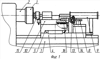 Станок для закатки концов трубных заготовок содержит станину 1, полый приводной шпиндель 2 с пневмопатроном 3, опорную плиту 4 с направляющими, поперечный суппорт 5 с направляющими, привод поперечного суппорта, состоящий из гидроцилиндра 6 и тяги 7, копир 8 и механизм подачи заготовок в пневмопатрон шпинделя, выполненный в виде пневмоцилиндра 9. Поперечный суппорт имеет возможность перемещения по направляющим опорной плиты 4 в плоскости, перпендикулярной оси шпинделя. На поперечном суппорте 5 установлен продольный суппорт 10, отрезной нож 11, призма 12 для размещения заготовки до и после закатки, а также кронштейн 13 с опорным роликом 14. Продольный суппорт 10, на котором установлен формующий инструмент 15, имеет возможность перемещения вдоль оси шпинделя по направляющим поперечного суппорта 5. Кроме того, станок оснащен пружиной растяжения 16, одним концом закрепленной в поперечном суппорте 5, а другим – в продольном суппорте 10. Пружина поджимает продольный суппорт 10 к рабочей поверхности копира 8 через опорный ролик 14, установленный в кронштейне 13. В исходном положении станка пружина 16 находится в растянутом состоянии.