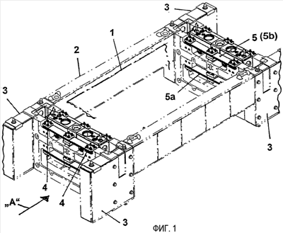Согласно фигурам 1 и 1А кристаллизатор 1 машины непрерывной разливки установлен с возможностью возвратно-поступательного движения в неподвижной раме 2 кристаллизатора, которая также содержит водяную рубашку 3 для подачи и отвода охлаждающей воды. Рама 2 кристаллизатора непрерывной разливки имеет на обоих концах прямоугольной основной формы верхнюю и нижнюю пару мест 4 шарнирного соединения или заделки для пружин 5, пакетов 5а пружин или рессорных пакетов 5b, которые обозначены как листовые пружины, однако могут иметь любые другие многоугольные, круглые или эллиптические, проходящие преимущественно в продольном направлении формы поперечного сечения. Пружины 5 могут располагаться, плотно прилегая друг к другу, образуя пакет 5а пружин или рессорный пакет 5b. При этом является предпочтительным применение пружин 5, пакетов 5а пружин или рессорных пакетов 5b из волокнистых композиционных материалов 6 с рабочими температурами 20-80°С, с высокой устойчивостью против коррозии, высокой длительной прочностью, механической стабильностью при заданной жесткости и механических свойствах, аналогичных свойствам пружинной стали.