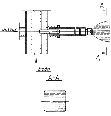 На приведенном чертеже, при определенных соотношениях вода-воздух и давлении воздуха перед входом его в форсунку, при выходе из сопел форсунки водовоздушной смеси возникает разряжение, стягивающее оба факела, истекающие из сопел, в один объемный. Создание объемного факела позволяет увеличить площадь потока поперечного сечения факела, а следовательно, обеспечивает более равномерное и эффективное охлаждение заготовки.