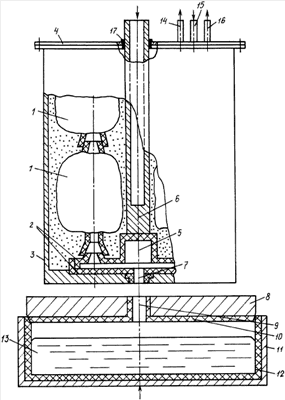 Для пояснения способа на чертеже 1 приведена рабочая схема (устройство). Устройство состоит из керамических форм 1, собранных с песчаными стержнями 2, расположенными в контейнере 3 с крышкой 4, камера прессования 5 с поршнем 6 и заливочным отверстием 7. Под контейнером 3 расположена камера выжимания 11, облицованная песчаной смесью 12, на которую установлен пуансон 8 с литниковым ходом 9 и облицовкой 10. В камеру выжимания 11 залит расплав 13. Между штоком поршня 6 и крышкой 4 расположено герметизирующее уплотнение 17. Для вакуумирования форм 1 имеется газопровод 14, а для создания газового давления на металл отливок имеется газопровод 15. Для связи контейнера 3 с атмосферой имеется газопровод 16.