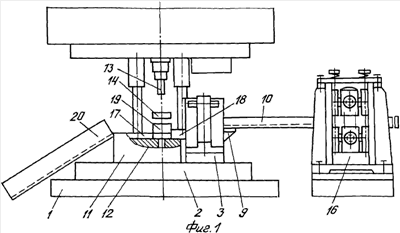 На столе 2 пресса 1 установлен штамп 11 с матрицей 12 и пробивным пуансоном 13. На штампе 11 закреплен прижим 14, а в матрице 12 – возвышение 15. Параллельно прессу 1 установлен задатчик 16, выполненный в виде валковой подачи. В штампе 11 установлен упор 17, в который упирается разрезаемый профиль 10 через заготовку 18 и готовую деталь 19. На столе пресса 1 закреплен транспортирующий лоток 20.