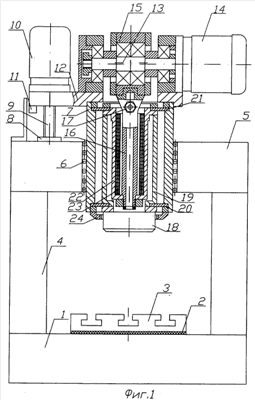 Изобретение относится к технологическому оборудованию для электрохимической обработки, в частности размерной обработки вибрирующим электродом-инструментом полостей штампов и пресс-форм, пера турбинных лопаток, а также электрохимического гравирования. Устройство для электрохимической обработки с периодическим изменением межэлектродного зазора, содержащее привод подач, состоящий из двигателя, ходового винта, гайки, и пиноль с датчиком перемещений, установленные с возможностью вертикального перемещения по направляющим портальной стойки, при этом внутри пиноли на центрирующих мембранах подвешен электрододержатель, жестко соединенный со штоком шатуна, приводимого от эксцентрикового вала электромеханического вибратора. Устройство также снабжено малоинерционным приводом микроперемещений и датчиком колебаний электрододержателя относительно пиноли, при этом шток шатуна выполнен полым и прикреплен к электрододержателю и центрирующим мембранам посредством охватывающего цилиндрического стакана и гильзы. Устройство позволяет увеличить точность и производительность обработки за счет возможности подачи импульса тока в строго синхронной последовательности на оптимальном МЭЗ и давлении электролита. 2 з.п. ф-лы, 2 ил.