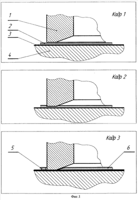На кадре 1 показана начальная стадия обработки, когда ЭИ 1 выставлен на начальный межэлектродный зазор (МЭЗ), а листовая заготовка 2 с приклеенной снизу диэлектрической подложкой 3 прижата к основанию 4.