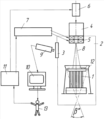 Оператор 13 через блок управления 11 подает команду на блок 6 питания систем пушки 4 и на генератор развертки 7 электронного луча 8. Генератор 7 развертки электронного луча 8 подает питание на отклоняющую систему 5 пушки 4, обеспечивая по заданной программе сканирование луча 8 по паяемой поверхности изделия 1. Чувствительный элемент тепловизионной камеры 9 формирует цифровой сигнал, пропорциональный энергии излучения, обеспечивая ввод сигнала с нее на информационно-вычислительную систему – компьютер 10. Производится обработка полученных данных и визуализация теплового изображения поверхности изделия 1. Оператор 13 по визуальному изображению поля производит коррекцию распределения мощности луча по площади, обеспечивая тем самым одинаковый тепловой режим всем паяемым участкам изделия 1.