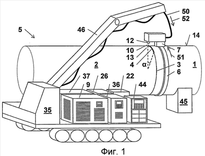 Первый вариант осуществления изобретения изображен на фиг. 1-3 в различных видах и подробностях. На фиг. 1 в общем виде в перспективе изображено орбитальное сварочное устройство на строительной площадке. Первый конец 1 трубы и второй конец 2 трубы прокладываемого на земле трубопровода 5 ориентированы и центрированы посредством известного внутреннего центрирующего устройства (не показано), по меньшей мере, одного трубного крана (не показан) и трубных опор 45 таким образом, что между первым концом 1 трубы и вторым концом 2 трубы имеется кольцевой стык 3 с определенным зазором менее 0,3 мм и без смещения кромок. На первом конце 1 трубы параллельно кольцевому стыку 3 и на постоянном расстоянии до внешней поверхности 14 первого конца 1 трубы расположен направляющий обруч 6 в виде стяжной ленты с направляющей шиной. На направляющем обруче 6 с возможностью перемещения вдоль него посредством электродвигателя вокруг первого конца 1 трубы по стрелке 51 установлена орбитальная тележка 7. На орбитальной тележке 7 смонтирована лазерная сварочная головка 12, выполненная с возможностью ориентации по кольцевому стыку 3 таким образом, что направляет сфокусированный лазерный луч 10 в зону 13 лазерной сварки, и при орбитальном перемещении посредством электродвигателя орбитальной тележки 7 выполняют сварной шов 4 вдоль кольцевого шва 3, здесь внешний сварной шов 4. Высота трубной опоры 45 выбрана таким образом, что возможно перемещение орбитальной тележки 7 на 360° вокруг первого конца трубы. Лазерный луч 10 вырабатывается высокомощным волоконным лазером 9, который с демпфированием от вибраций размещен на расстоянии от орбитальной тележки 7 на транспортном средстве 35. Лазерный луч 10 направляют по гибкому волноводу 11 (фиг.2), который находится в рукавном кожухе 50, перемещаемом посредством крана 46 транспортного средства 35 к орбитальной тележке 7, от высокомощного волоконного лазера 9 к лазерной сварочной головке 12. Рукавный кожух 50 подтягивают посредством крана 46 по стрелке 52 с возможностью беспрепятственного перемещения орбитальной тележки 7. Кран 46 может использоваться также для монтажа направляющего обруча 6 и орбитальной тележки 7 и для удержания экранирующего устройства (не показано), которое экранирует место сварки от окружения и наоборот, чтобы, с одной стороны, защитить обслуживающий персонал от опасных отражений лазерного луча, а с другой стороны, чтобы отделять воздух, влагу и загрязнения от места сварки. На транспортном средстве установлены также генератор 36, по меньшей мере, для вырабатывания необходимой для работы высокомощного волоконного лазера 9 мощности и система 37, по меньшей мере, для охлаждения высокомощного волоконного лазера 9. Другие ссылочные позиции фиг. 1 приведены ниже в описании других фигур. Кроме того, в описании последующих фигур приведена ссылка на ссылочные позиции предшествующих фигур.