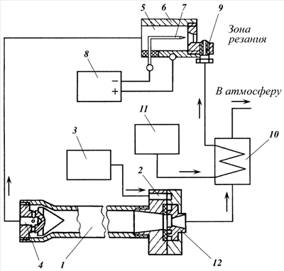 Сжатый воздух от источника 3 поступает в сопловой ввод 2 вихревой трубы 1, в которой происходит разделение подаваемого воздуха на горячий и холодные потоки. Горячий поток из патрубка вывода горячего потока 4 поступает в ионизатор 5. На электроды 6 и 7 от электрического источника питания 8 подается высокое напряжение, под действием которого между электродами 6 и 7 возникает коронный разряд. В электрическом поле коронного разряда происходит ионизация горячего потока воздуха, который через отверстие в положительном электроде 6 направленной струей подается в зону резания металлорежущего станка. Струя ионизированного воздуха с высокой скоростью обтекает полость эжектора 9. За счет создаваемого в эжекторе 9 разряжения в поток ионизированного воздуха всасывается охлажденная жидкость из трубного пространства теплообменника 10, которая распыляется и вместе с ионизированным воздухом подается в зону резания. Воздух, выходящий из патрубка вывода холодного потока 12, подается в межтрубное пространство теплообменника 10, где он понижает температуру жидкой среды, находящейся в трубном пространстве и поступающей из источника жидкой среды 11, а затем выводится в атмосферу.