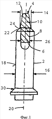 Прямое соединение наконечника 4, соответственно его концевой части 6, в выполненной соответствующим образом выемке 8 реализуется, в частности, путем клеевого или горячего прессования или запрессованного или зажимного соединения. Целесообразно располагать выемку 8 коаксиально с продольной осью 20. Чтобы иметь возможность точно позиционировать наконечник 4 вдоль оси в болте 2, между аксиально выступающей наружу передней частью 10 и расположенной в выемке 8 концевой частью 6 предусмотрен уступ 24, выполненный таким образом, чтобы максимальный наружный диаметр 14 передней части 10 на некоторую заданную величину был больше наружного диаметра 26 концевой части 6. Уступ 24 образует тем самым определенный упор, в частности, при вставке и/или при изготовлении соединения между болтом 2 и наконечником 4, благодаря чему задается точная аксиальная позиция и в конечном итоге определенная аксиальная длина всего установочного элемента. Кроме того, посредством уступа 24 предотвращается недопустимо высокая нагрузка или даже разрушение соединения между наконечником 4 и болтом 2. Болт 2 содержит на своем противоположном наконечнику 4 конце крепежный элемент 30 для крепления установочного элемента в инструменте, в частности сварочном инструменте для сварки давлением. Крепежный элемент 30 содержит выполненный в виде радиального расширения фланец для фиксирования инструмента. Здесь следует подчеркнуть, что установочный элемент выполнен предпочтительно как центрирующий штифт или установочный штифт и применяется для центрирования и базирования строительных деталей, в частности нескольких жестяных деталей или по меньшей мере одной жестяной детали с резьбовой гайкой. Далее, установочный элемент предусмотрен прежде всего для применения, соответственно использования, в сварочных инструментах, в частности сварочных инструментах для сварки давлением, соответственно в такого рода устройствах или машинах. Кроме того, установочный элемент по изобретению отличается малыми наружными размерами. Так, наружный диаметр 16 болта 2 задан в пределах от 3 до 12 мм, предпочтительно от 3,5 до 10 мм, в частности от 4 до 8,5 мм. Тем самым применение предлагаемого установочного элемента позволяет центрировать, соответственно устанавливать, даже очень мелкие резьбовые гайки с внутренними диаметрами М4, или М5, или М6, или М8 и соединять с жестяными деталями в соответствующих машинах или инструментах, в частности сварочных инструментах для сварки давлением, причем и при таких малых радиальных размерах как раз надежно предотвращается отламывание наконечника, так как согласно изобретению он выполнен в виде металлического наконечника 4 и интегрирован в болт 2 из высокопрочной керамики и/или износостойкого металлокерамического материала, и в конечном итоге обеспечивает высокую функциональную надежность и/или длительный срок службы.