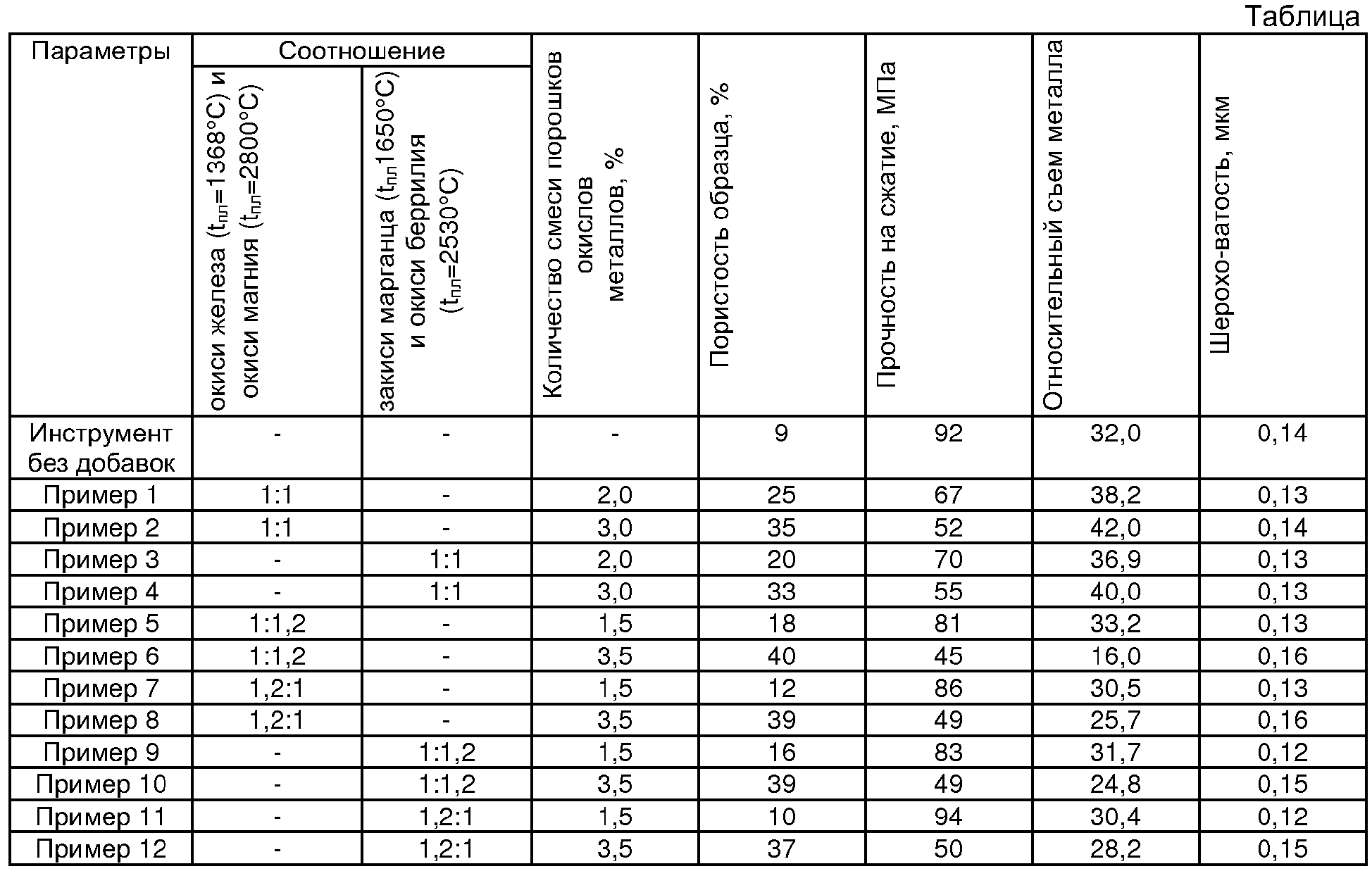 При несоблюдении соотношения 1:1 между содержанием окиси металла с температурой плавления не ниже 2300°С и окиси металла с температурой плавления не выше 1700°С ухудшается качество инструмента и снижается производительность обработки.