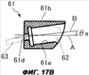 Как показано на фиг.17А и 17В, световой колпачок 61 сформирован путем соединения первой половины 61а (показана на фиг.17А) колпачка и второй половины 61b (показана на фиг.17В) колпачка. Следует отметить, что заштрихованные части на фиг.17А и 17В показывают соединительные поверхности половин 61а и 61b. Как показано на фиг.17В, осветительный элемент 62 вначале помещают в гнездо (углубление) 61е, сформированное во второй половине 61b, причем подводящий провод 63 вытягивают через отверстие 61d. Затем ко второй половине 61b колпачка присоединяют первую половину 61а, таким способом образуя световой колпачок 61, который может быть вставлен в гнездо 64b кармана 64а. В это время оптическая ось осветительного элемента 62, т.е. центральная ось В гнезда 61е, регулируется до заданного положения под углом а относительно центральной оси А светового колпачка 61.