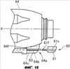 В такой конструкции карман 64а осветительного устройства (место крепления осветительного устройства) является одним целым с кожухом 64 ударного механизма и находится на нижней внешней поверхности кожуха 64 ударного механизма. Осветительное устройство (световой узел) 60 установлено в кармане 64а. Осветительное устройство 60 содержит осветительный элемент 62, представляющий собой, например, СИД. Как будет описано ниже, оптическая ось осветительного элемента 62 регулируется таким образом, что осветительный элемент 62 может излучать свет вперед, влево и вправо от держателя 66 концевого инструмента. Далее, осветительный элемент 62 устанавливается в положение как можно ближе к оси вращения X. Осветительный элемент 62 излучает свет вперед, влево и вправо от держателя 66 концевого инструмента синхронно с приведением куркового выключателя 55 в положение «Включено», что позволяет использовать ударный инструмент 51 в темном рабочем месте.