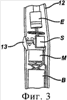 Бритва 10 выполнена с возможностью вибрирования. Как указывалось выше, бритвы, обеспечивающие возвратно-поступательные движения, вибрацию или колебательные движения, именуются в данном тексте как “вибрационные безопасные бритвы”. Они описаны, например, в патентах US 5046249; US 5299354; US 5794342 и US 6481104. Описанные в любом из этих патентов механизмы, обеспечивающие вибрацию, при желании могут быть использованы и в заявляемой бритве. Например, пригодный вибрационный механизм схематично показан на фиг.3. Как видно из фиг.3, бритва может включать роторный двигатель 14, питаемый от батареи В, и эксцентриковый элемент Е, придающий движениям колебательный характер. Двигатель М, например электродвигатель, размещен внутри ручки и снабжен выведенным из него валом (не показан), на котором закреплен эксцентриковый элемент Е, например эксцентриковый груз. Двигатель с высокой скоростью вращает эксцентриковый груз, что вызывает вибрацию бритвы и, в частности, лезвий. Например, эксцентриковый груз можно вращать со скоростью примерно от 5000 до 10000 оборотов в минуту, вызывая при этом вибрацию корпуса картриджа с амплитудой примерно в диапазоне 0,002-0,01 дюйма. Пользователь может включить двигатель, отклоняя кнопку 13 и приводя таким образом в действие механизм выключателя S.
