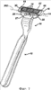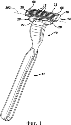 Как видно на фиг.1 и фиг.2, безопасная бритва 10 содержит ручку 12 и заменяемый картридж 14. Как показано на фиг.2, картридж 14 отсоединяется от ручки 12. Картридж 14 содержит корпус 16 с лезвиями 18, защитный элемент 20 и козырек 22. Козырек 22 обеспечивает бритье вспомогательным средством, облегчающим скольжение, и установлен в паз 66 в тыльной части корпуса 16. Козырек 22 может быть выполнен из материала, содержащего смесь гидрофобного материала и вымываемого водой гидрофильного полимерного материала, как это известно и описано, например, в патентах US 5113585 и US 5454164. Защитный элемент 20 содержит оребренный эластомерный элемент, смонтированный у передней поверхности корпуса 16, и служит для захвата и натяжения кожи пользователя; также могут быть использованы и другие средства сцепления с кожей, например, как это описано в патенте US 5191712.