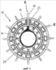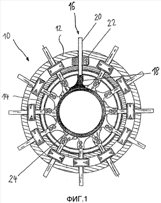 Перпендикулярно направлению изготовления трубы 24 (сравн. с фиг.1) впереди расположено по кругу 12 блоков сегментов. Каждый блок сегментов имеет по два шпиндельных держателя 20, которые установлены на расстоянии друг от друга (фиг.2) и соответственно взаимодействуют с относящейся к ним шестеренчатой гайкой 22. Шестеренчатые гайки 22 опять-таки с помощью зубчатого кольца 26, которое проходит по периметру между расположенными на расстоянии по оси шестеренчатыми гайками, перемещаются совместно с ним. Для этого зубчатое кольцо 26 на обоих своих краях имеет входящие в зацепление с шестеренчатой гайкой 22 зубья.