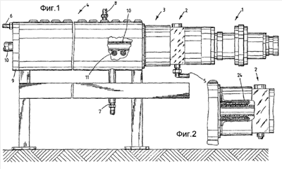 На фиг.1 под позицией 1 расположена устанавливаемая головка трубы, которая, если смотреть по направлению изготовления продукции, присоединена к не изображенному на чертеже экструдеру. К устанавливаемой головке 1 трубы подключается вакуумный всасывающий колпак или пневматический колокол 2, который оборудован подключением для вакуума или давления и в котором предусмотрены измерительные устройства, которые в зависимости от желаемого наружного диаметра трубы регулируют вакуум или давление в колоколе, так что благодаря этому осуществляется регулирование потока расплава, имеющего форму трубы, до желаемого наружного диаметра, т.е. происходит расширение или сдавливание потока. В колпаке для создания вакуума или в пневматическом колоколе 2 происходит предварительное охлаждение заготовки из расплава, и в колоколе 2 в соединении с устанавливаемой головкой 1 трубы может быть установлена точная толщина стенки трубы, при этом толщина стенки трубы может варьироваться в зависимости от наружного диаметра трубы. К колпаку для создания вакуума или пневматическому колоколу 2 подсоединяется калибровочная станция 3, в которой с возможностью вращения расположена калибровочная корзина 24. Здесь с помощью механической централизованной регулировки осуществляется точная калибровка наружного диаметра заготовки из расплава и уже частично отвердевшей трубы 10, при этом эта калибровочная станция 3 может применяться для всех рассматриваемых синтетических материалов. В этой калибровочной станции 3 может быть получено некоторое количество размеров труб с различной толщиной стенок.
