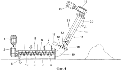 Трубный конвейер 11 включает трубу 21, в которой проходит ось 13, приводимая в действие двигателем 14 с помощью механизма передачи 15, расположенного у расположенного ниже по потоку конца трубы 21. В расположенном выше по потоку конце трубы 21 находится винтообразный измельчитель 12, прикрепленный к оси 13. Измельчитель 12 имеет конический наконечник 18 (см. Фиг.6), прикрепленный к концу оси 13. Выходящий из устройства уплотнения 10 обезвоженный осадок разбивается сначала коническим наконечником 18 и затем измельчается измельчителем 12. Обезвоженный и размельченный осадок выгружается из трубного конвейера 11 у его верхнего нисходящего конца через разгрузочное отверстие 20.
