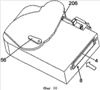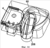 На фиг.9-15 показана схема системы печати типа D2 в соответствии с третьим вариантом выполнения настоящего изобретения. Система печати содержит кассету 4 с лентой, ленточный принтер и кассету 106 с красящей лентой. Ленточный принтер имеет отверстие 8 на его боковой стороне для вставки кассеты 4 с лентой в поперечном направлении. Ленточный принтер имеет другое отверстие 58 для вставки кассеты 206 с красящей лентой в поперечном направлении. Ленточный принтер, кроме того, содержит печатную головку 14, установленную на поворотном механизме 60, предназначенном для поворота печатной головки в положение для печати через рычаг 56, установленный для вращения принтера. Печатная головка 14 продолжается через отверстие в кассете 206 с красящей лентой для взаимодействия с валиком, установленным в кассете 4 с лентой так, что лента и красящая лента располагаются между ними.