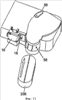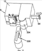 В другом варианте выполнения два дополнительных участка стенки могут быть предусмотрены на стороне держателя, противоположной указанным участкам 54 стенки с отверстием между ними, через которое печатная головка может проходить, когда крышка закрыта. Держатель 42 кассеты установлен в корпусе 12 принтера с возможностью ограниченного вращения относительно корпуса, в результате чего, когда крышка 10 открыта, держатель кассеты поворачивается на угол поворота меньший, чем угол поворота крышки. Держатель 54 кассеты и крышка 10 установлены на общей оси с возможностью вращения. Крышка 10 может поворачиваться на угол до приблизительно 90°, но чаще до 70° и еще чаще до 50°. Держатель 54 может поворачиваться на угол до 45°, но чаще до 35° и еще чаще до 25°, то есть приблизительно на половину угла поворота крышки.