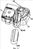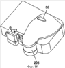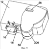 На фиг.11 и 12 представлен механизм 60 поворота, на котором установлена печатная головка 14. В первом положении, представленном на фиг.11 и 12, печатная головка 14 расположена с противоположной стороны указанного участка 58 установки кассеты с красящей лентой относительно участка 8 установки кассеты с лентой. После вставки кассеты 206 с красящей лентой в участок установки в принтере механизм 60 поворачивается в направлении по часовой стрелке с помощью рычага 56, в результате чего печатная головка 14, установленная на рычаге 62 механизма 60, проходит через отверстие в кассете с красящей лентой, как показано на фиг.13, для взаимодействия с валиком на кассете 4 с лентой, при этом лента и красящая лента располагаются между ними. В положении для печати механизм поворота удерживает/зажимает кассету с красящей лентой в положении, как показано на фиг.14 и 15.