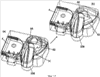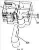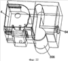На фиг.18-23 более подробно показана процедура вставки кассеты с красящей лентой. Вначале, как показано на фиг.18 и 19, ручку/рычаг 64, на которой установлена печатная головка 14, перемещают из ее фиксированного положения, в котором печатная головка находится в положении печати, в положение на противоположной стороне участка 304 установки кассеты с красящей лентой от указанного участка 8 установки кассеты с лентой. Кассета 306 с красящей лентой может затем быть вставлена на участок 304 установки кассеты с красящей лентой. После вставки кассеты 306 с красящей лентой пользователь активирует механизм 64 печатной головки, в результате чего печатная головка 14 перемещается в положение печати и фиксируется в этом положении с помощью фиксирующего механизма. В этом положении механизм 64 печатной головки также удерживает на месте кассету с красящей лентой. Печатная головка может быть зафиксирована в этом положении с помощью системы выталкиваемого фиксатора.