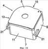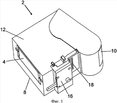 Участок установки кассеты на крышке содержит две полости 36, 38, при этом участок 40 установки печатной головки располагается между ними. Участок 40 установки печатной головки продолжается от нижней поверхности крышки 10 до положения, расположенного на расстоянии от верхней поверхности крышки 10. Таким образом, образуется зазор между участком 40 установки печатной головки и верхней поверхностью крышки 10 для установки в него верхней поверхности 30 кассеты 6 с красящей лентой. В альтернативном варианте выполнения, в котором кассета с красящей лентой предусмотрена на нижней поверхности, также предусмотрен зазор между участком установки печатной головки и нижней поверхностью крышки для установки в него нижней поверхности кассеты с красящей лентой.