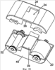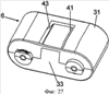 Вариант выполнения кассеты с красящей лентой показан на фиг.27-29. Кассета 6 с красящей лентой содержит корпус, имеющий переднюю и заднюю части 31, 33, которые могут соединяться друг с другом для простоты изготовления. Корпус имеет участок 20 подачи красящей ленты, участок 22 приема красящей ленты и отверстие 24 между ними. На участке 20 подачи красящей ленты установлена катушка 35 подачи красящей ленты, в то время как на участке 22 приема красящей ленты расположена катушка 37 приема красящей ленты. Катушка 35 подачи красящей ленты содержит запас красящей ленты 39. Красящая лента 39 проходит через прорезь 41 на участке 20 подачи красящей ленты корпуса и через отверстие 24 между участком 20 подачи красящей ленты и участком 22 приема красящей ленты в корпусе. Красящая лента проходит через прорезь 43 на участке 22 приема красящей ленты корпуса в катушку 37 приема красящей ленты, установленную в нем. Участок 20 подачи красящей ленты корпуса и участок 22 приема красящей ленты корпуса соединены на верхней и нижней сторонах верхним и нижним поперечными элементами 26, 28. В конкретном варианте выполнения, представленном на фиг.2, верхний поперечный элемент 28 выполнен как единая деталь с верхней поверхностью 30 корпуса. Верхняя поверхность продолжается через отверстие 24 между двумя участками 20, 22 корпуса и обеспечивает дополнительную прочность для предотвращения поломки поперечных элементов при работе с ними. Как показано на фиг.27-29, также может быть предусмотрена нижняя поверхность 45, которая продолжаются под отверстием 24, между двумя участками корпуса, что дополнительно усиливает корпус кассеты.