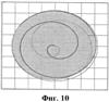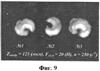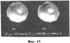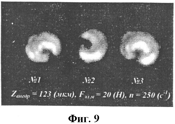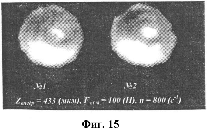 Фиг.8 и 9; Фиг.10 и 11; Фиг.12 и 13; Фиг.14 и 15 – теоретическое (расчетное) и реальное (фотоснимки) изменение формы дискретных структурных элементов формируемого изображения в зависимости от скорости вращения инструмента и скорости его осевой подачи посредством ударного воздействия (режимы процесса динамического микрофрезерования указаны непосредственно на фотоснимках).