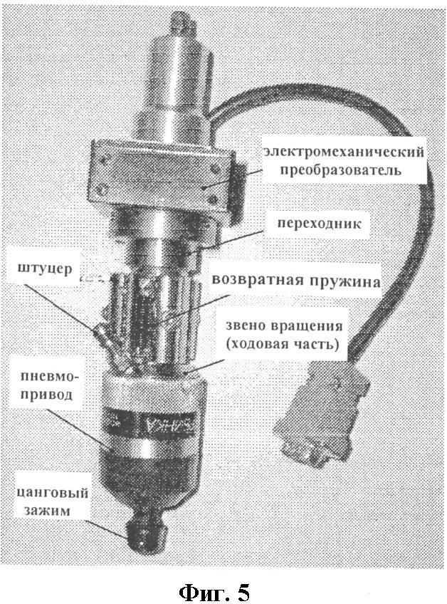 Исполнительный узел 9 состоит из жестко закрепленного на корпусе электромеханического преобразователя 13, сердечник 32 которого охвачен пружиной 34, реализующей возвратно-поступательное действие сердечника 32, который путем силового воздействия приводит в движение толкатель 16 (функционально являющийся хвостовиком турбины 26 пневмопривода 25) через деталь 14, регулирующую ход сердечника 32. Турбина 26 связана с инструментом 28 через цанговый зажим 27, соединенный с турбиной 26 посредством резьбового соединения. Движение вращения осуществляется путем подачи сжатого воздуха через штуцер 19 пневмопривода 25. Движение обратного хода инструмента 28 осуществляется двумя возвратными пружинами 20, соединяющими корпус пневмопривода 25 с направляющей 15 винтами 21. Точность возвратно-поступательного движения толкателя 16 обеспечивают шесть шариковых подшипников 23 качения, которые соединены с направляющей 15 тремя прижимами 18 через винты 22. Направляющая 15 соединена с корпусом переходника 17 резьбовым соединением, который привинчен к корпусу электромеханического преобразователя 13 тремя винтами 24. Вход регулируемого пневмотривода 25 вращения инструмента 28 соединен с пятым выходом контроллера 2 и с катушкой 33 электромеханического преобразователя. Портальный каркас 4 закреплен на основании 29.