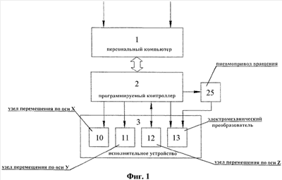 Исполнительное устройство 3 состоит из портального каркаса 4, закрепленного на нем (с возможностью перемещения вдоль одной из осей каркаса 4) моста 5, на котором размещена (с возможностью перемещения вдоль оси моста 5) траверса 6 кадровой развертки с поперечной направляющей 7, несущая каретку 8 строчной развертки. На каретке 8 закреплен корпус исполнительного узла 9 с динамически перемещающимся вдоль оси Z и одновременно вращающимся от независимого пневмопривода 26 инструментом 28. Вход узла 10 перемещения траверсы 6 соединен с первым выходом контроллера 2, вход узла 11 перемещения каретки 8 строчной развертки соединен со вторым выходом контроллера 2. Исполнительный узел 9 выполнен в виде корпуса, установленного на каретке 8 строчной развертки с возможностью его перемещения в вертикальном направлении (ось Z). Узел 12 вертикального перемещения исполнительного устройства 3 соединен с третьим выходом контроллера 2 и обеспечивает регулировку (корреляцию) величины зазора (координата Z) посредством следящей системы с датчиком обратной связи. Вертикальное перемещение узла 12 осуществляется вращением регулировочного винта 30 (пропущенного через отверстие в каретке 8) в гайке 31, закрепленной на корпусе исполнительного узла 9.